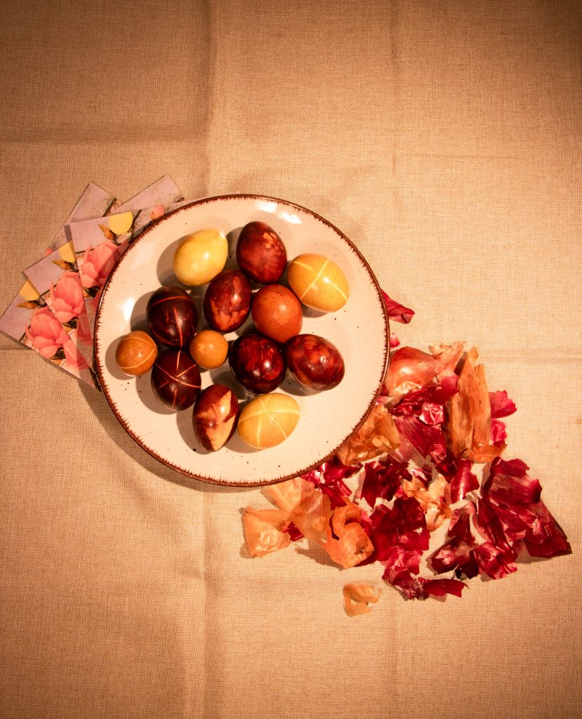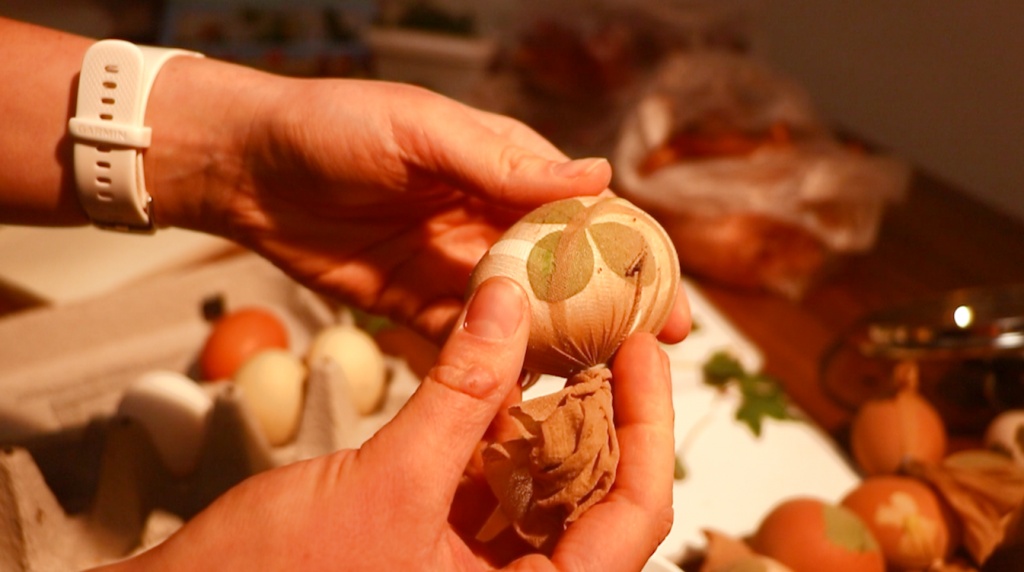 Potrebujemo: jajca, čebulne olupke, kurkumo, najlonke/hlačne nogavice, sukanec/elastike, škarje, različne liste in cvetove (regrat, marjetica, vijolica …),