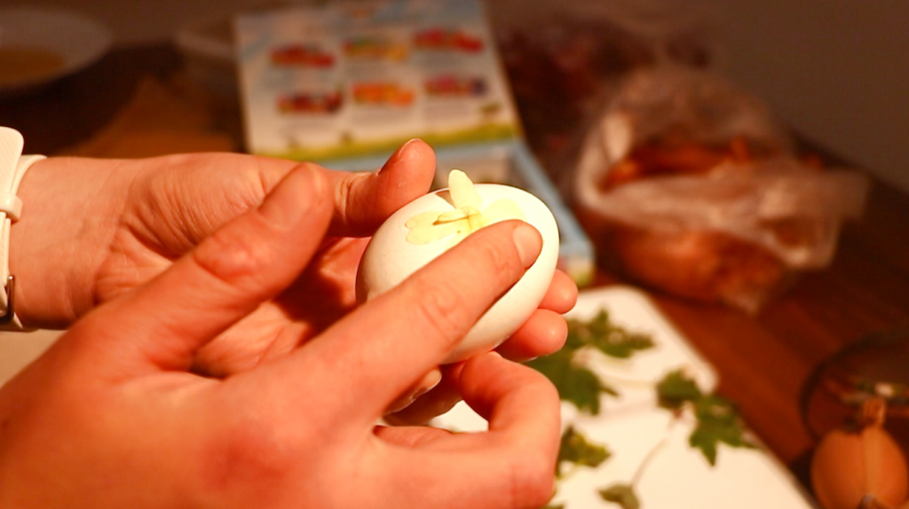- Nato sledi zavijanje jajc: Izbereš poljubno rastlino, jo razpreš in položiš na jajce. Pri tem si lahko pomagaš z vodo, saj se na mokro jajce rastline lepše prilepijo. Jajce nato zaobjameš in oviješ s hlačno nogavico. Previdno jo napneš in na koncu zaviješ in zavežeš. Za zavezovanje lahko uporabiš sukanec, elastike ali pa narediš vozel kar iz hlačne nogavice. Tako pripravljena jajca položimo v vodo s čebulnimi olupki in vodo oziroma vodo s kurkumo.