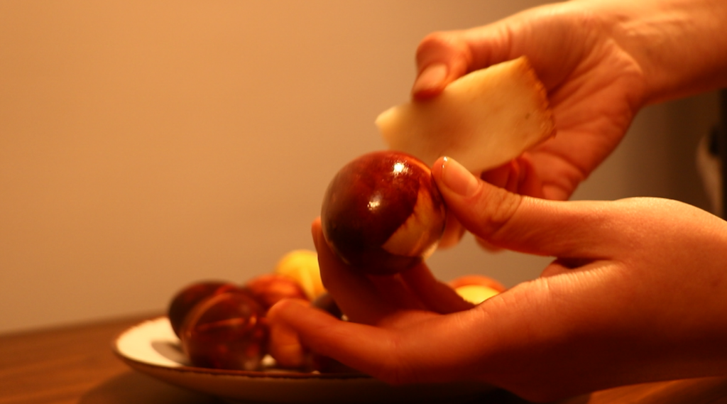 - Ko so vsa jajca zavita nastavimo srednjo temperaturo in kuhamo 20 do 30 minut. Voda ne sme preveč vreti, da nam jajca ne popokajo. Odtenki so odvisni od časa namakanja. Če želimo intenzivnejšo barvo, lahko jajca pustimo namakati v vodi tudi čez noč. Ko jih odvijamo, odstranimo nogavico in rastlino.
